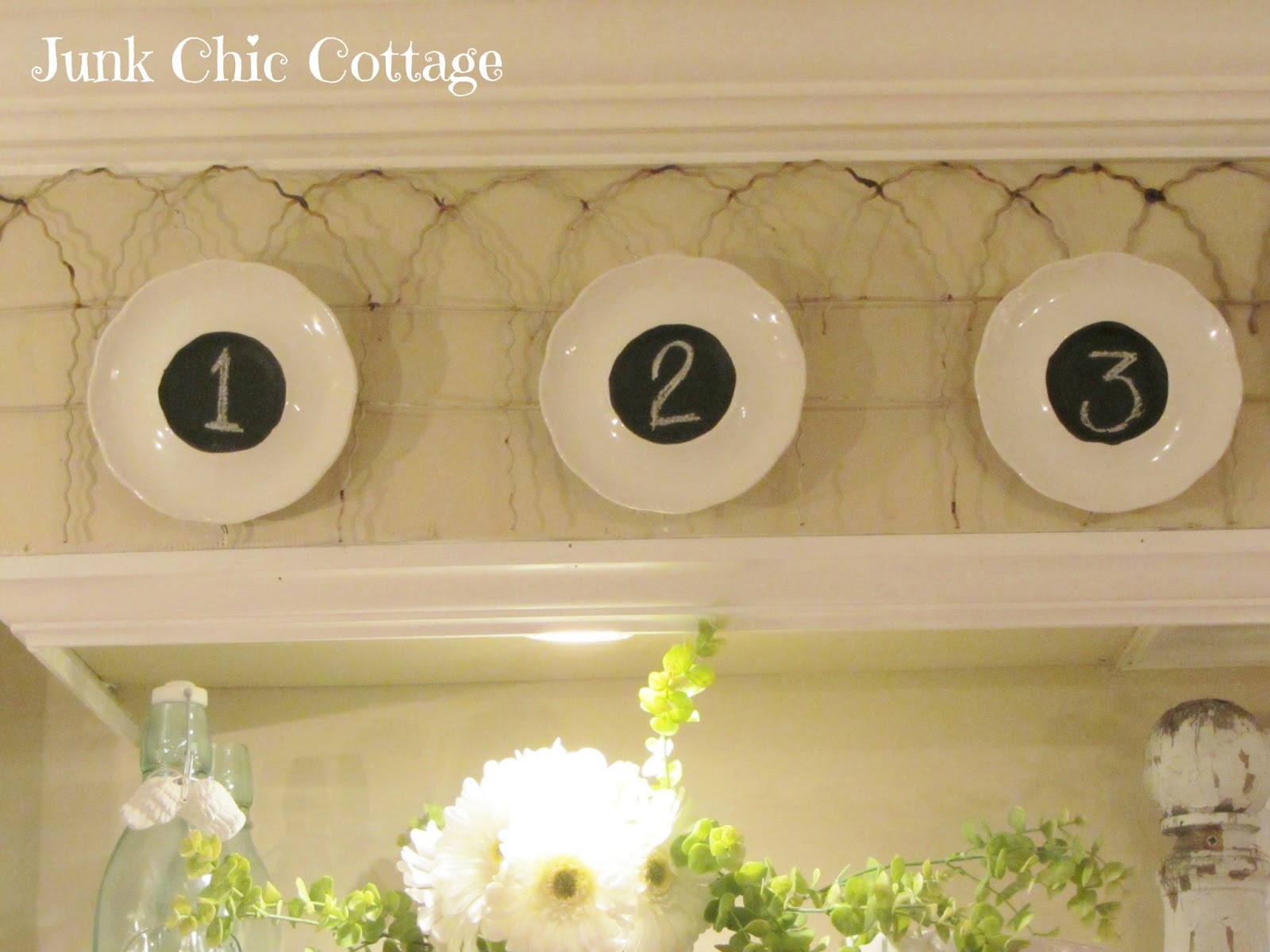 | I had some little saucers that were missing their coffee cups so I painted the circles in chalk board paint and numbered them with chalk to hang above the sink on the garden fencing. |