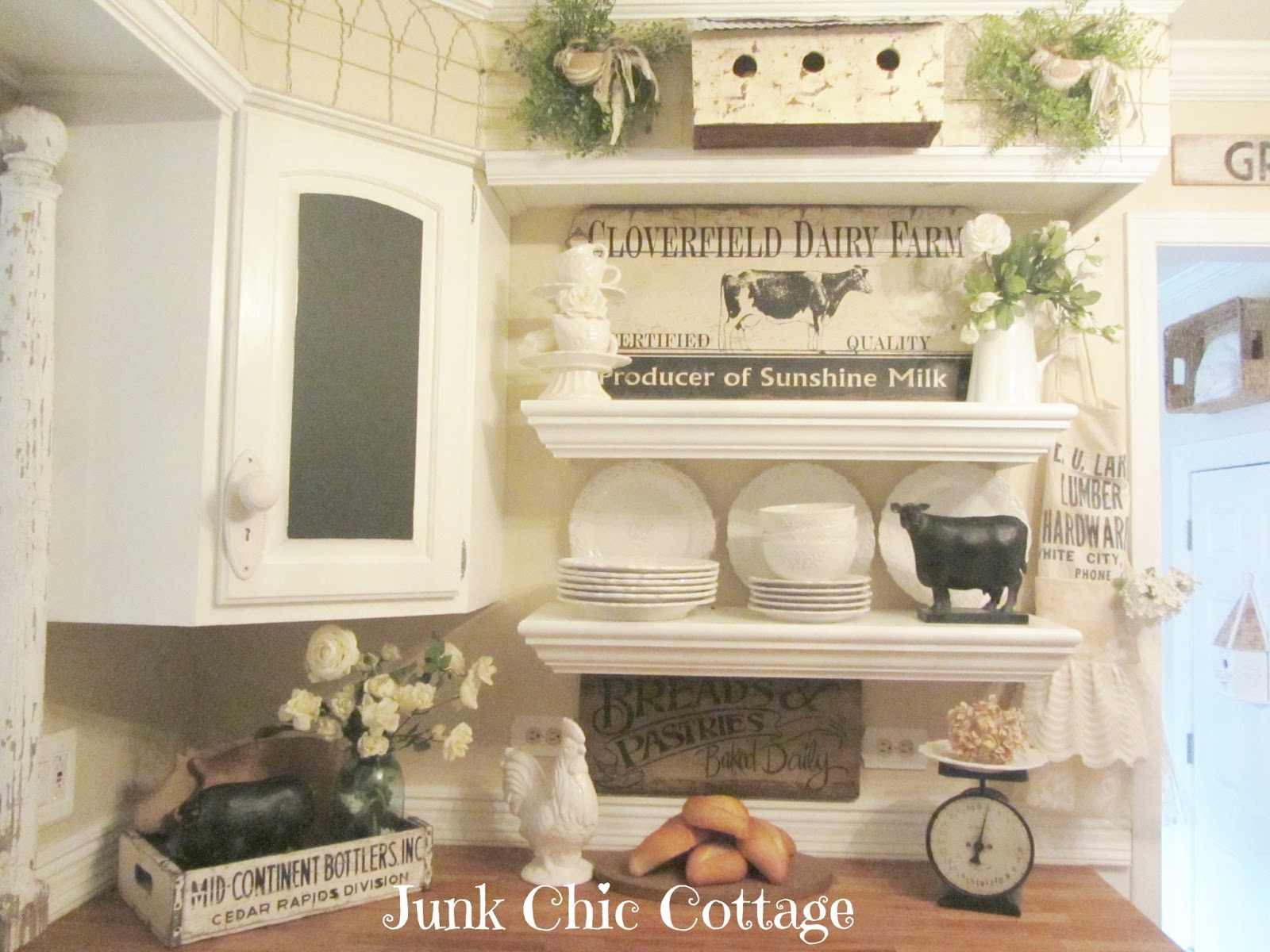 You definitely made the right choice, going with the open shelving it really brings the look together, your kitchen is fabulous just the right mix of the shabby farmhouse look, I love your accessories, the vintage garden fence above your shelving is so cute and quirky, live the pretty apron too! The cow and scale are a perfect touch they help unite the new chalk board cabinet. Oh and dont let me forget that fabulous old window you have that loojs into the other room framed by the chippy salvaged posts is perfect I'm jealous; ) have a awesome day Kris thanks for the insperation today Xo Elle@ sweetpeaschicnshabbies