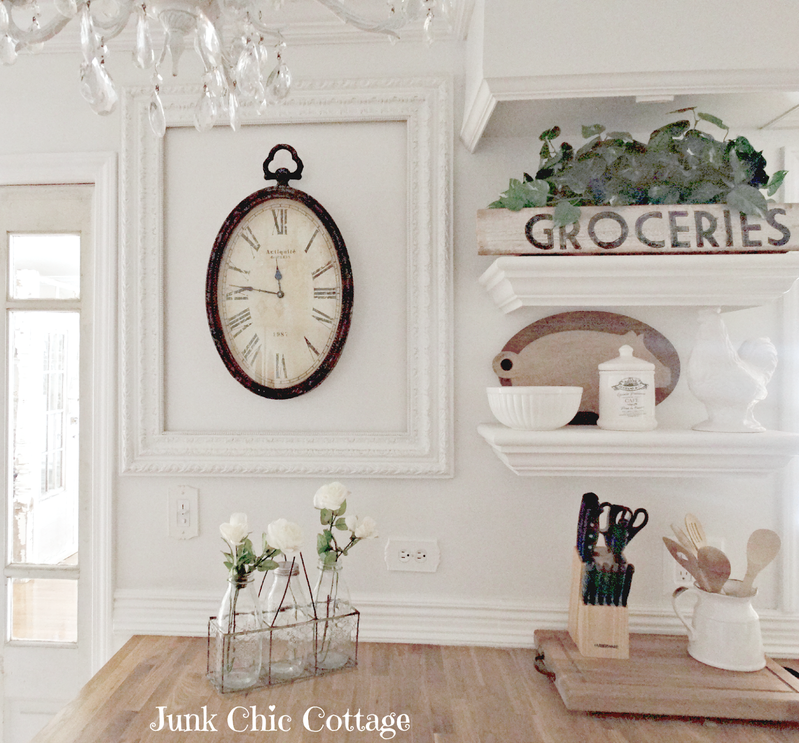| Love to use the old frames I had and repurpose them in this kitchen decor. I framed out the chandeliers and also my kitchen clock. |