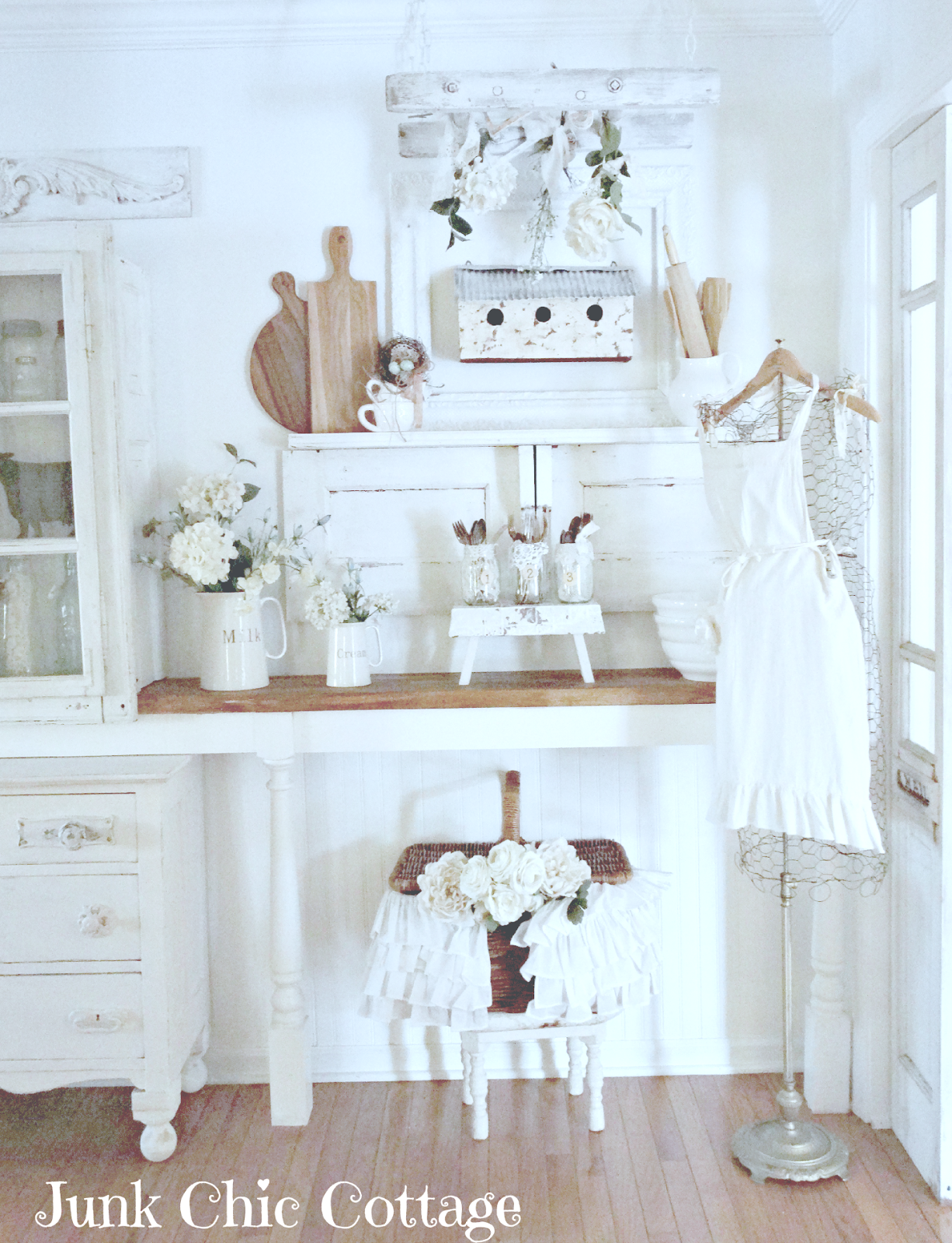 Kris, You and Hubby did a fabulous update on your kitchen with little or no money!! Your kitchen was beautiful the other way but it looks more open! I was anxious to see the MS picket fence color on your walls....I actually sampled on a wall today. I LOVE a bright and cheery home and yours couldn't be more beautiful......your dress form with apron, the cottage chest and chandys with the frames are my favorite!! So much to see and enjoy! Blessings~~~Roxie