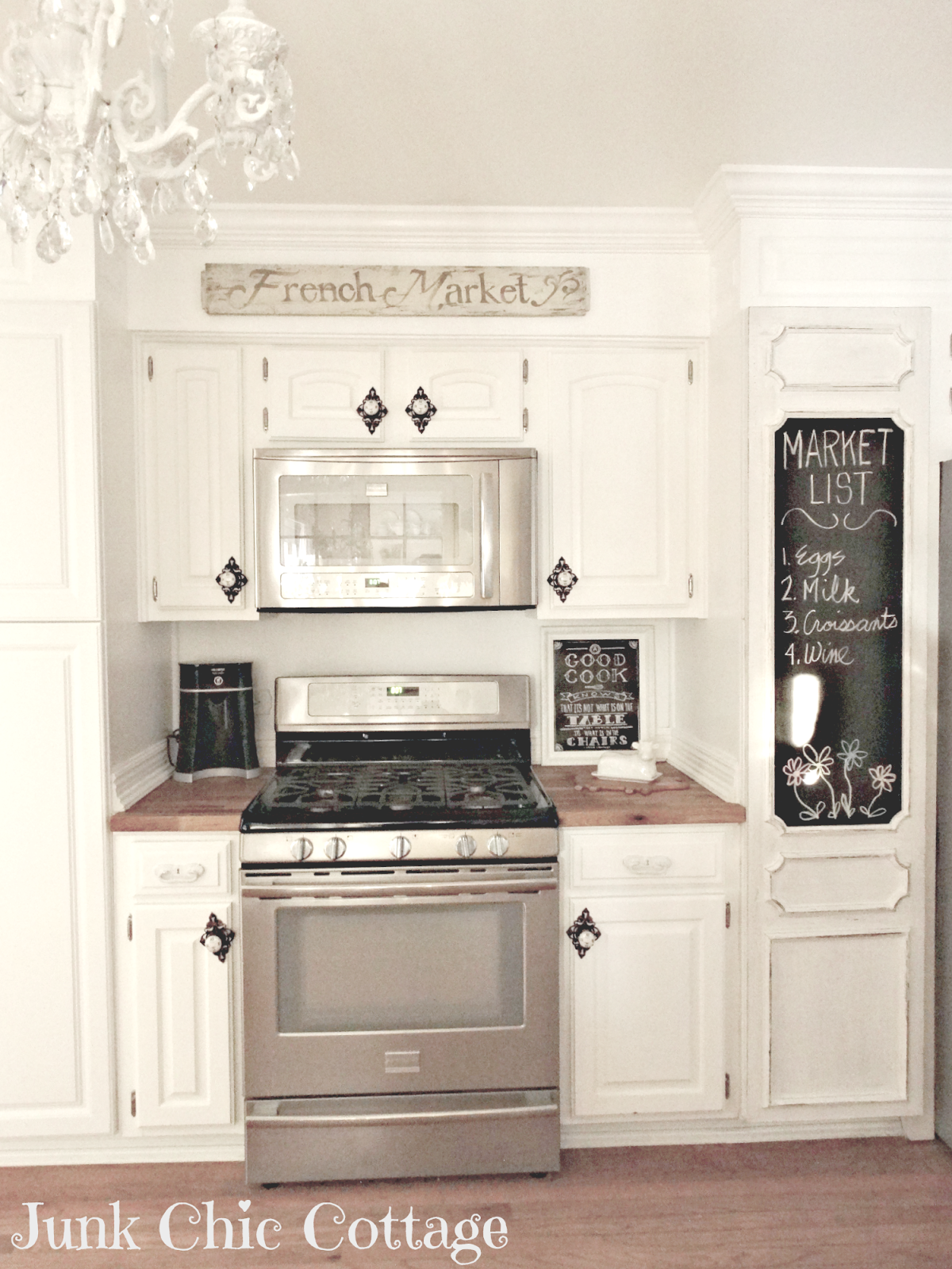 Kris it is so pretty, those chandys are . I also love the chalkboards they look great with the white.